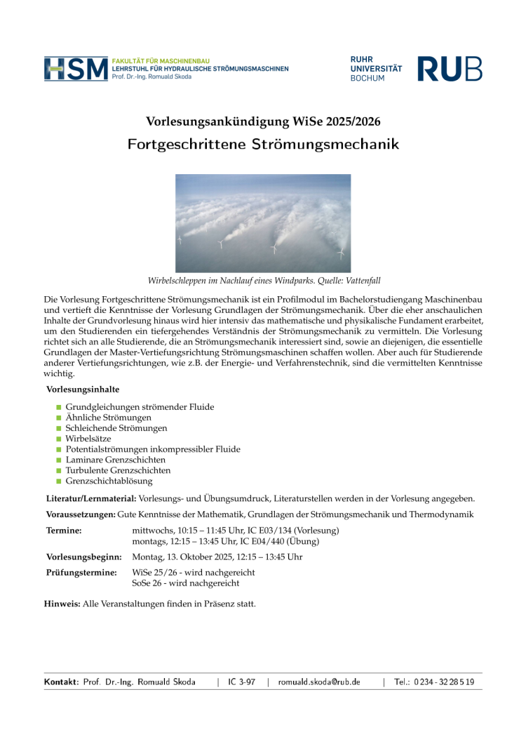 Die vom Lehrstuhl für Hydraulische Strömungsmaschinen angebotenen Lehrveranstaltungen wenden sich an Studierende der Studiengänge Maschinenbau, Umwelttechnik und Ressourcenmanagement (UTRM) sowie Sales Engineering and Product Management (SEPM). Die Lehrveranstaltungen behandeln folgende Themenschwerpunkte: